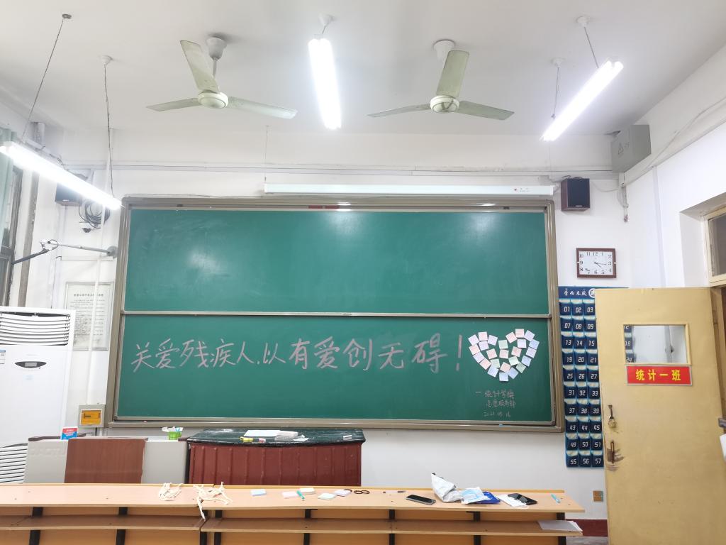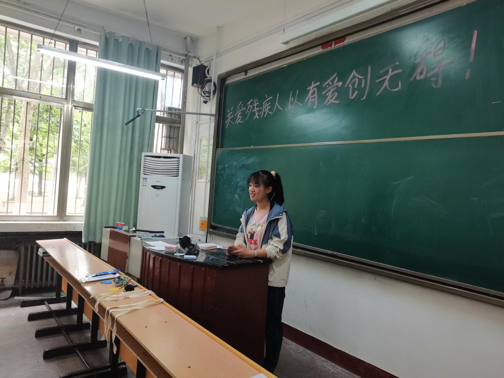 活动于下午三点准时开始,主持人介绍完活动主题及环节之后,志愿者们分别进行了“一天黑暗的路径”“ 用心拥抱世界”“以拳定型”“以你的心诠释我的爱”等室内室外相结合的小游戏,通过这些小游戏,同学们感受到了残疾人在生活中的不便,更进一步体会到此次活动举办的意义。最后,主持人总结本次活动,并引导志愿者在便利贴上写下自己对此次活动的感想、或是对残疾人的寄语,贴在准备好的小黑板上。