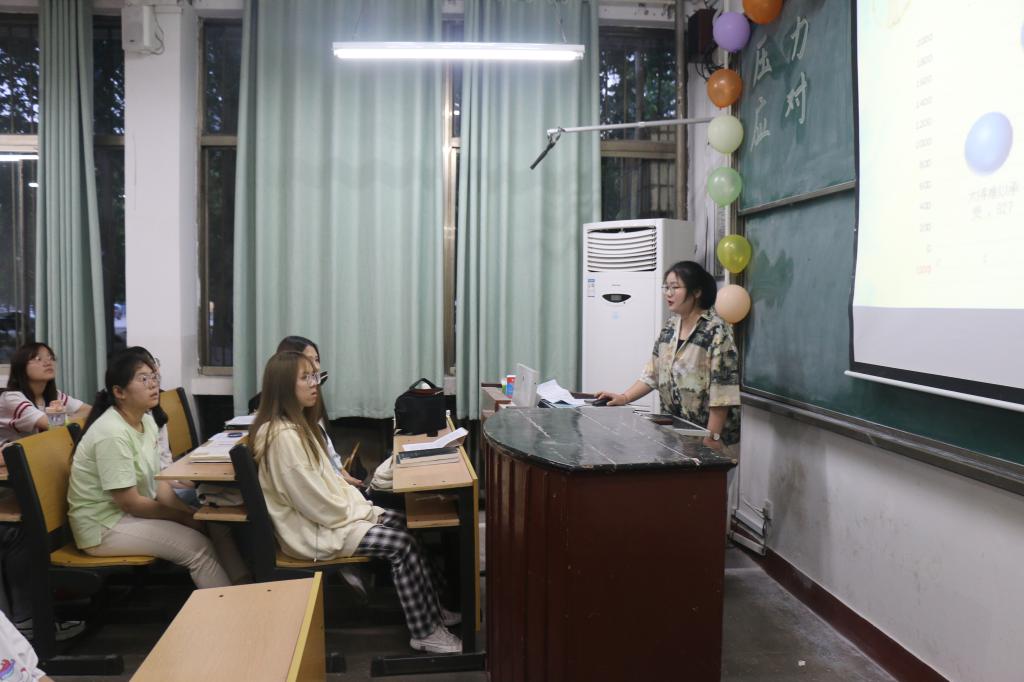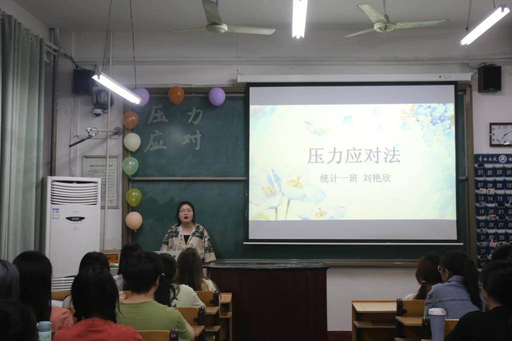 宣讲会上,各班心理委员分别从压力的来源,压力的认识,压力的影响,如何克服压力四个方面来讲解压力。各班心理委员还在会议上还分享了缓解压力的方法。首先,心理委员们建议同学们要保持良好的心态,积极面对难题,正确认识自己,对自己的身体素质、知识才能、社会适应力等要有自知之明,尽量避免做一些力所不及的事情,引起不必要的压力;学会自我调节,加强自身修养以适当方式宣泄自己内心的不快和抑郁,以解除心理压抑和精神紧张,善于自我调节,有张有弛;具体的可以做感兴趣的事,或是找个没人的地方大声地喊叫;平时多听音乐,轻快、舒畅的音乐能使人的精神得到有效放松;开怀大笑是消除精神压力的最佳方法,可以忘掉忧虑。