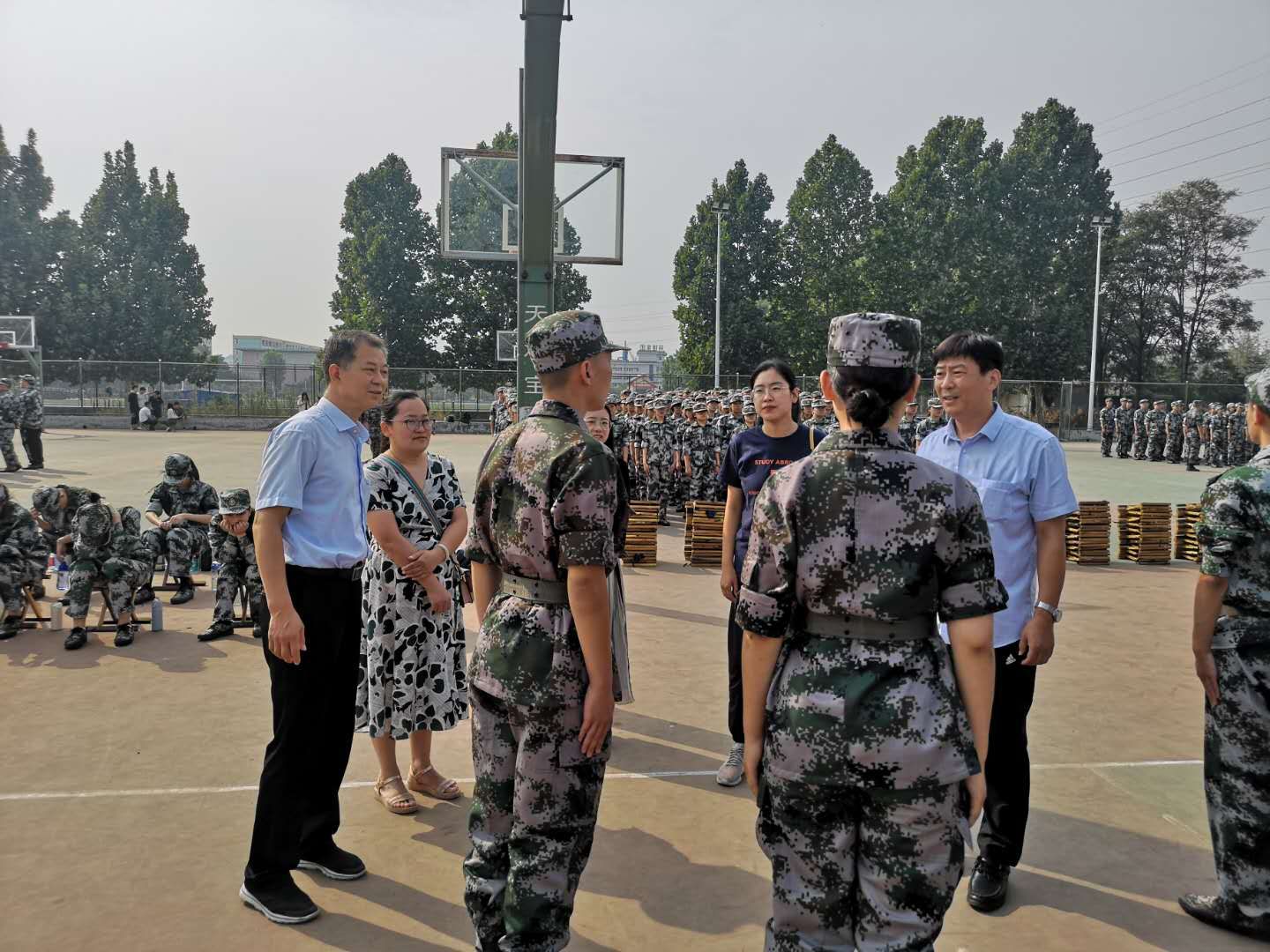 党委书记刘明海、党委副书记季中、团委书记李宴美、18级辅导员张风姣、20级辅导员张庆伟,到西操场查看2020级新生军训情况,关注新生身体问题,询问教官新生表现情况。教官现场指导新生摆放马扎、水杯,练习站军姿,学院领导对认真学习的同学们表示称赞,并鼓励同学们要认真对待军训,努力完成军训任务。