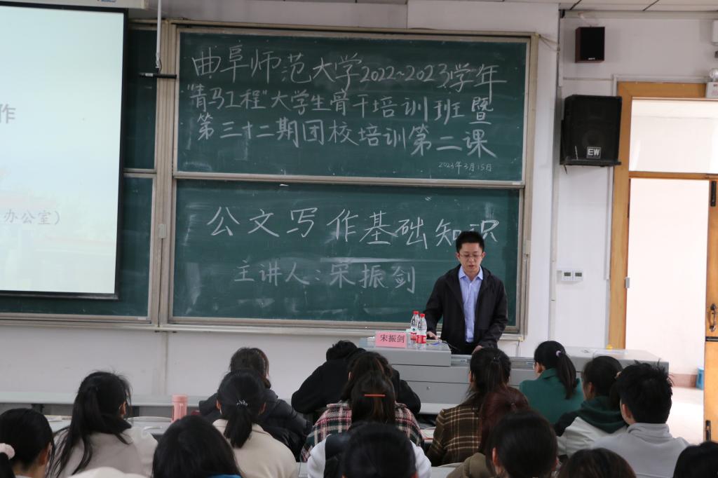 2022—2023 学年“青马工程”大学生骨干培训班暨第三十二期团校培训第二课——公文写作专题培训。此次培训由学校办公室主任宋振剑主讲,学院团委书记李宴美主持,学院学生党员、积极分子、各年级班长团支书、团委、学生会全体成员参加。