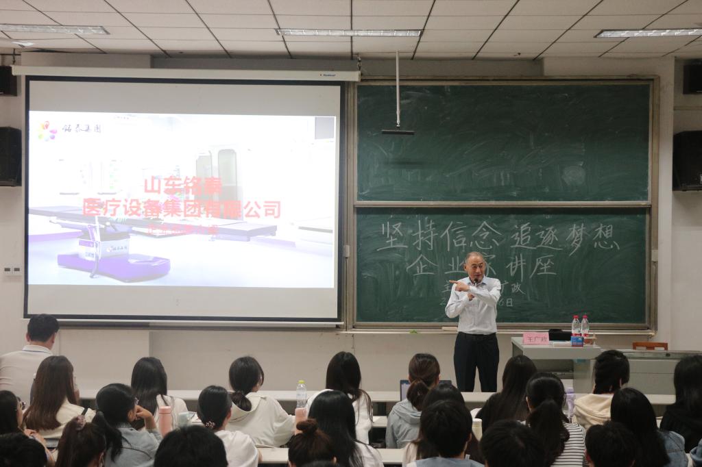 讲座中,王广政先生首先讲述了自己一路走来艰苦创业的历程,从企业简介、徽标内涵、企业资质、发明专利、发展历程等方面,对山东铭泰医疗设备集团有限公司进行企业品牌介绍。接着,他用具体示例,向同学们强调技术创新对公司发展的重要意义。最后,王广政先生对全体学子寄予厚望,希望每一位学子都能明确自身的奋斗方向,通过不懈努力奋斗,实现自己人生价值。