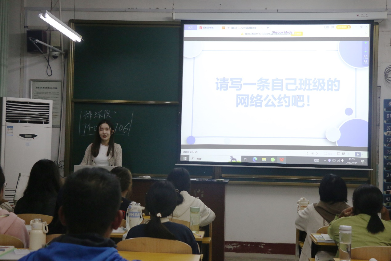 于9月24日晚七点在2023级各班教室举办“‘E’言议行”新生网络公约建设宣讲会。本次宣讲会由学院学生会宣传部组织宣讲,全体2023级学生参加。