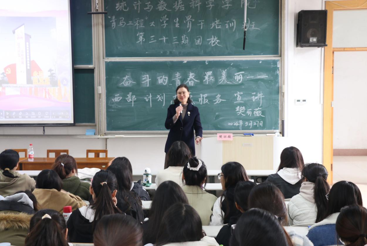 于3月27日下午两点在综合楼206教室举办“青马工程”大学生骨干培训班暨第三十三期团校培训第三课。本次青马课以“奋斗的青春最美丽——西部计划志愿服务”为主题。本次课程邀请经济学院2009级校友时庄街道团工委书记樊丽薇主讲,bet365