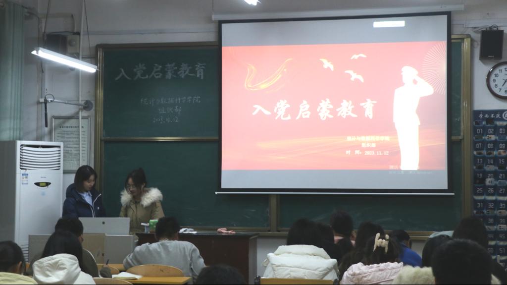 于11月12日晚上19:00在学院固定教室103、107、111开展入党启蒙教育宣讲会。本次会议由本科生党支部组织委员李宴美组织,组织部部长韩雨彤、王亚男主持,2023级全体学生参加。