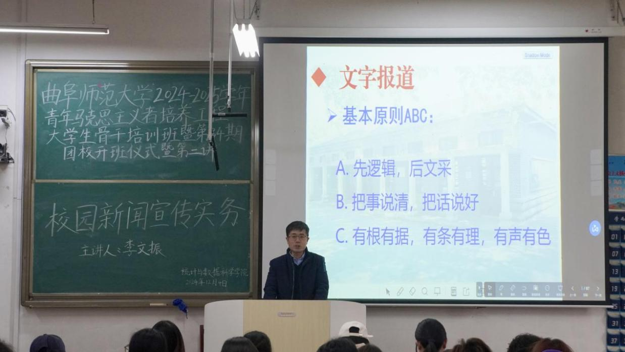 于2024年12月4日下午2:30在西联一教室召开2024-2025学年青年马克思主义者培养工程大学生骨干培训班暨第34期团校开班仪式暨第二讲——校园新闻宣传实务。会议邀请校宣传部李文振主讲,bet365