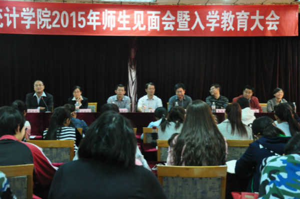 院长、博士生导师尹传存教授致辞。尹院长首先对2015级新生的到来致以热烈的欢迎和亲切的问候。接着,他向新生们介绍了学院和专业的总体情况,就学科评估、专业评估,中国经济学学位的发展做出讲话。副院长赵胜利教授在接下来的讲话中对统计学与应用统计学的就业前景作了客观介绍,鼓励同学们要好好学习专业课知识,打好基础,为将来的就业做好充分准备。大会第三项,教务员刘艳丽老师对选课、考试等一系列规章制度进行了讲解,这些对大家过好大学生活有很好的指导意义。最后,团委书记刘永礼老师对本次60周年校庆期间的安全问题做了嘱咐,提醒同学们要礼貌待人,用微笑迎接每一位来校的校友。