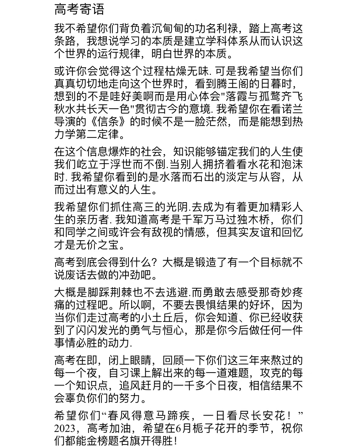 本次活动一方面为高考考生加油鼓劲,帮助他们从容应考,另一方面为同学们提供了一个展示自我的平台,同时也激励同学们努力奋斗。