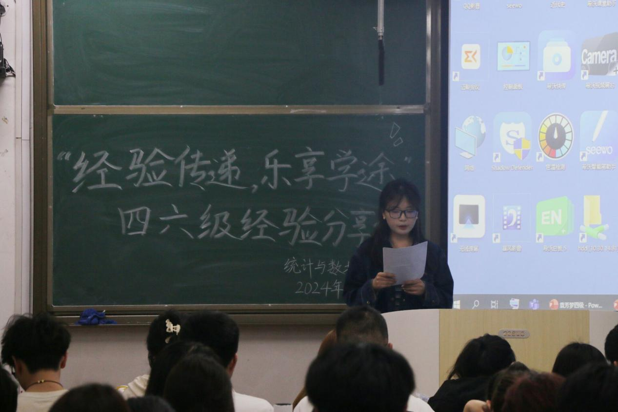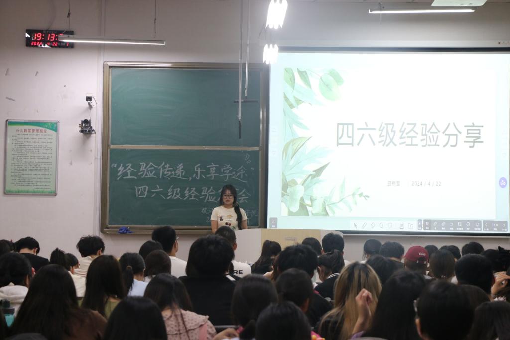 于2024年4月22日19:00在西联教室一举办“经验传递,乐享学途”四六级经验分享会,2023级全体学生参加。