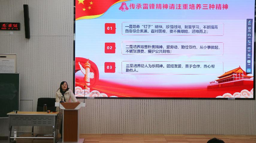 接着,李宴美书记分享了雷锋精神在国际上的影响力,并学习了雷锋日记名言。最后李宴美书记重点阐述如何学习雷锋精神。她强调,传承雷锋精神需要培养三种精神:一是“钉子”精神,鼓励大家珍惜时间,刻苦学习,勇于面对困难;二是艰苦朴素精神,倡导热爱劳动,勤俭节约;三是助人为乐精神,呼吁同学们团结友爱,热心帮助他人,学生干部更要发挥模范带头作用。