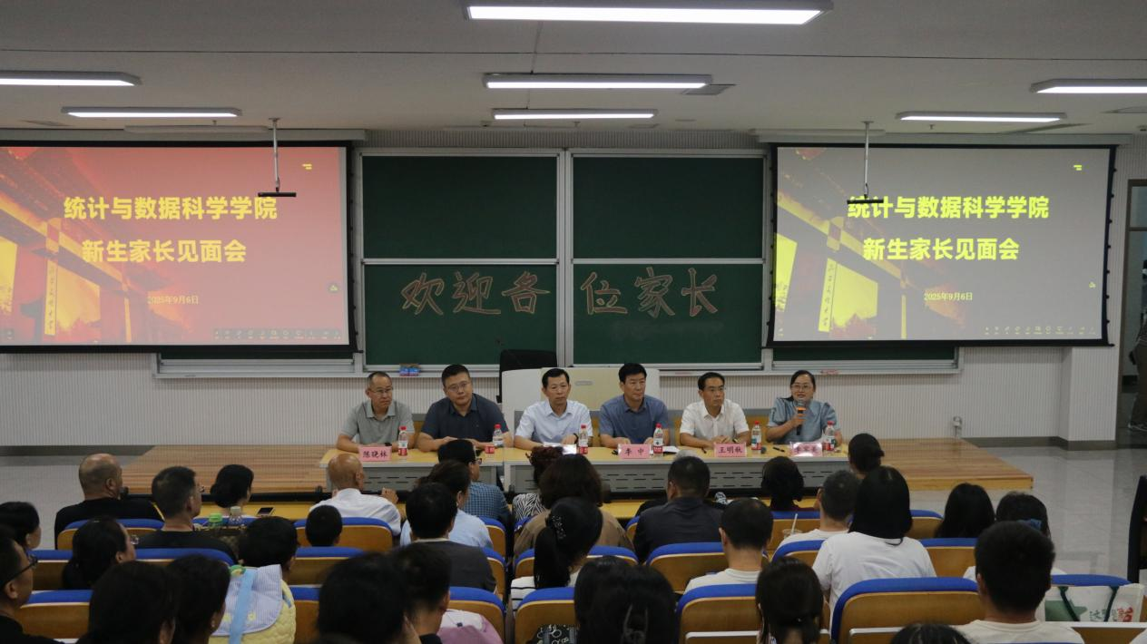 于致知楼B101举行新生家长见面会,院长赵胜利、党委副书记季中、副院长赵翔华、团委书记李宴美和统计系主任陈晓林、数据科学系主任王明秋,及2025级新生家长代表参加见面会,会议由学院团委书记李宴美主持。