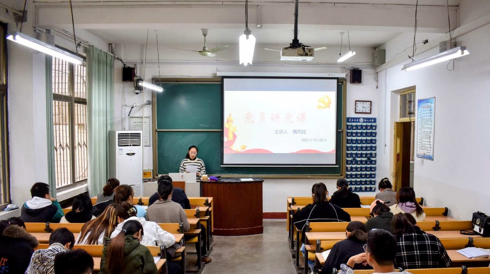 103教室举办“党员讲党课”活动。本次活动特邀隋雨陆,张钰,孟伟龙三位党员同志进行党课宣讲。本科生党支部全体党员及预备党员到会聆听。