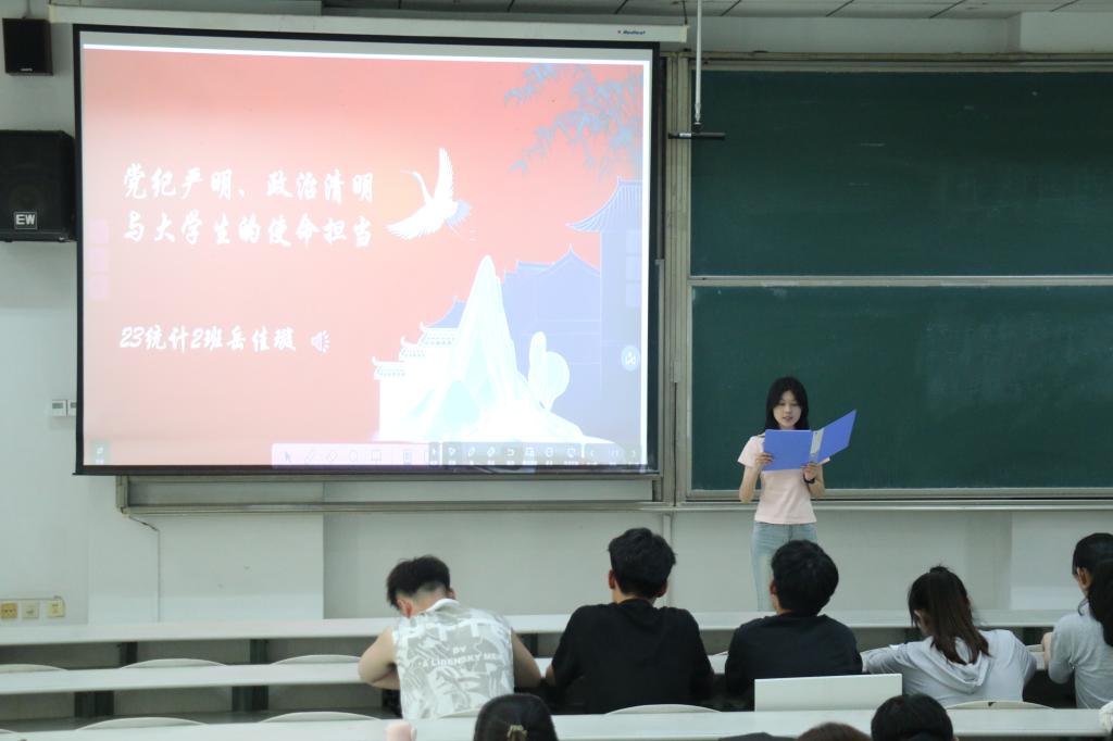 比赛开始,首先由主持人介绍比赛目的和比赛规则,强调比赛的公平公正性。随后,主持人宣布比赛开始,参赛者依次上台演讲。参赛者们围绕“党纪严明、政治清明”的主题,进行了精彩的演讲,展现了自身对党纪法规的深刻理解和对政治清明的坚定追求。在众多参赛者中何孝颜、岳佳璇、孙艺萌同学凭借其富有感染力的演讲和深刻的见解脱颖而出,荣获一等奖。其中,何孝颜同学讲述了秋收起义中一个米缸的故事,映照出党严明的政治纪律,也充分体现她对党纪法规在中国共产党发展过程中的重要作用的深刻理解;岳佳璇同学就作为新时代大学生应如何将党纪严明、政治清明内化于心外化于行对同学们提出了几点具体要求;孙艺萌同学则着重讲述党纪严明,政治清明对于新时代青年学子的成长发展和国家的重要意义。