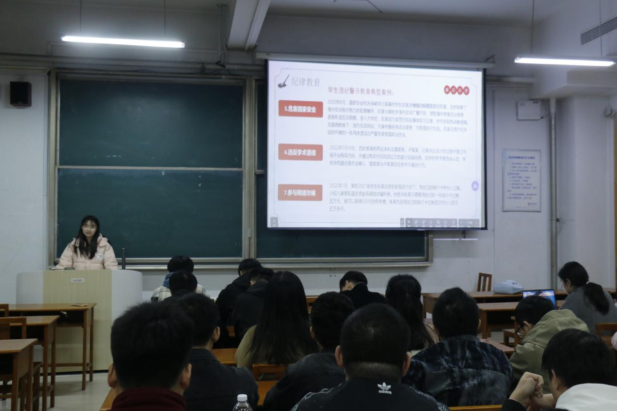 于2024年11月18日19:00在综合楼103室,召开了2024级研究生廉洁教育主题班会。此次廉洁教育主题班会围绕五个主题展开,包括廉洁的内涵与重要性、诚信教育、纪律教育、生活美德和如何做到廉洁。会议由研究生辅导员管阳老师主持,管老师与2024级应用统计专硕班团支书翟伟颖共同主讲,全体2024级研究生参加。
