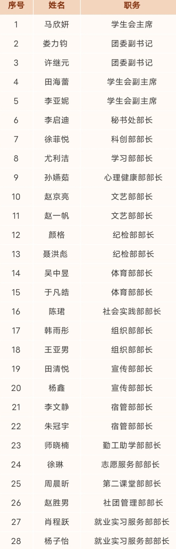 (通讯员:田清悦)2023年4月1日上午八点,bet365 第二届团委学生会换届选举会议在综合楼203教室顺利召开。本着公平、公开、公正的原则,经个人申请、竞选演讲、综合审查等环节,最终确定马欣妍等28人为bet365 第二届团委学生干部,现将换届名单公示如下: