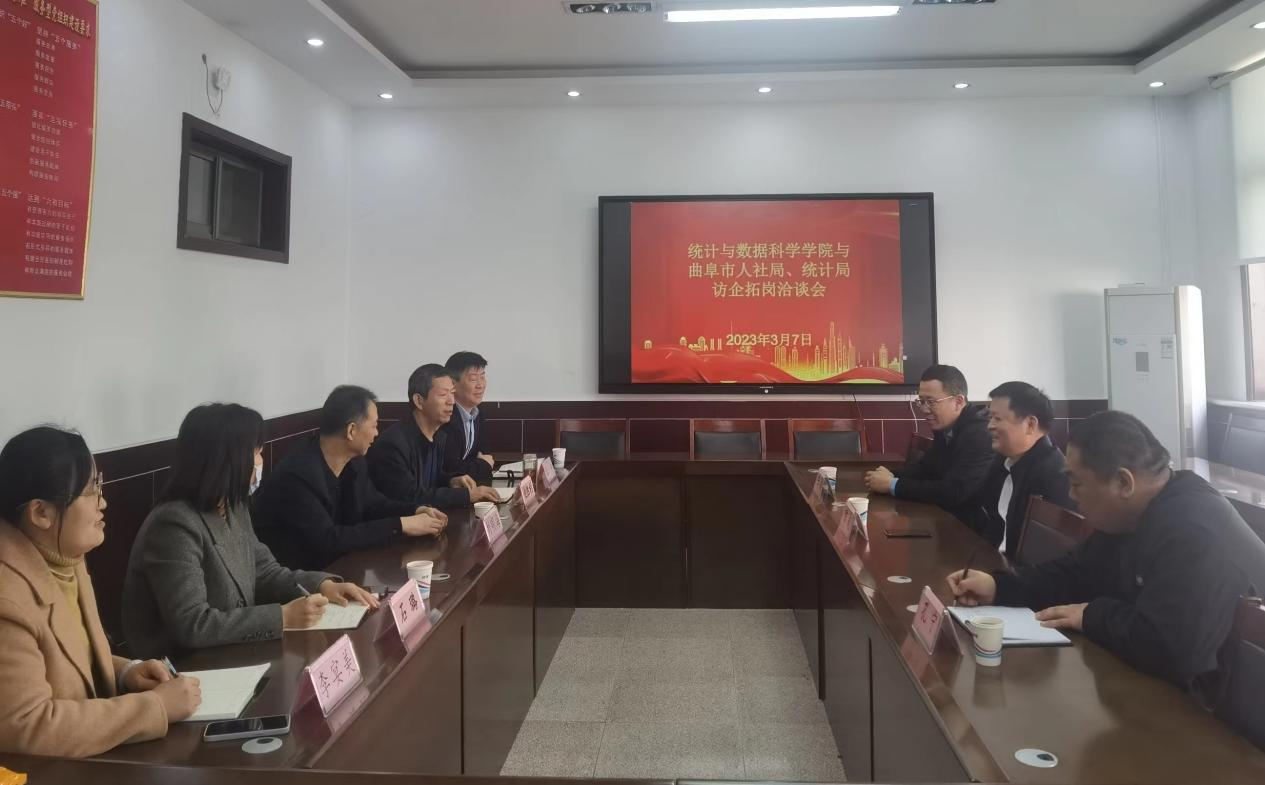 与曲阜市资源优势互补,合作共赢,取得了一系列合作成果,希望双方在人才资源共享、实习实践等方面进一步加强交流合作。赵胜利院长结合学科专业特色、人才培养特点、学生就业意向等就进一步加强曲阜市企业人才政策的推介宣传、人才交流对接、科研项目转化等工作与曲阜市统计局、人社局相关负责人达成意向。