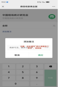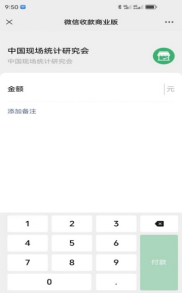 请扫描下方的二维码,点击“添加备注”,填写“统计调查”与注册人姓名及单位(该信息是核对缴费人员信息的依据,请您在缴费时,务必清楚填写;例如,A单位的张三注册缴费,填写备注信息为:“统计调查张三-A单位”);接着,在金额处填写注册费用额度;最后,点击右下角“付款”按钮,完成会议注册缴费。