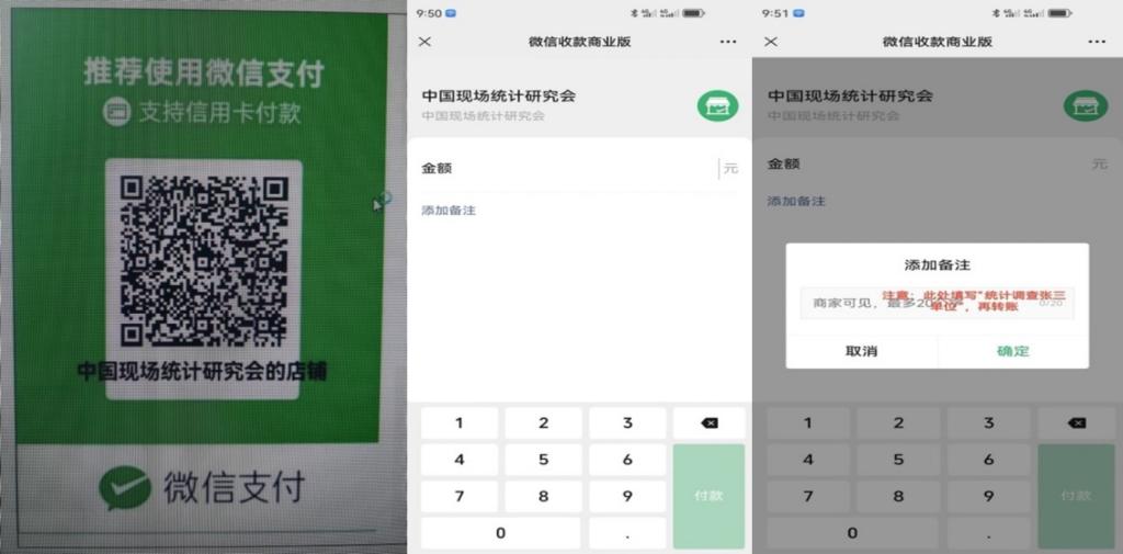 请扫描下方的二维码,点击“添加备注”,填写“统计调查”与注册人姓名及单位(该信息是核对缴费人员信息的依据,请您在缴费时,务必清楚填写;例如,A单位的张三注册缴费,填写备注信息为:“统计调查张三-A单位”);接着,在金额处填写注册费用额度;最后,点击右下角“付款”按钮,完成会议注册缴费。